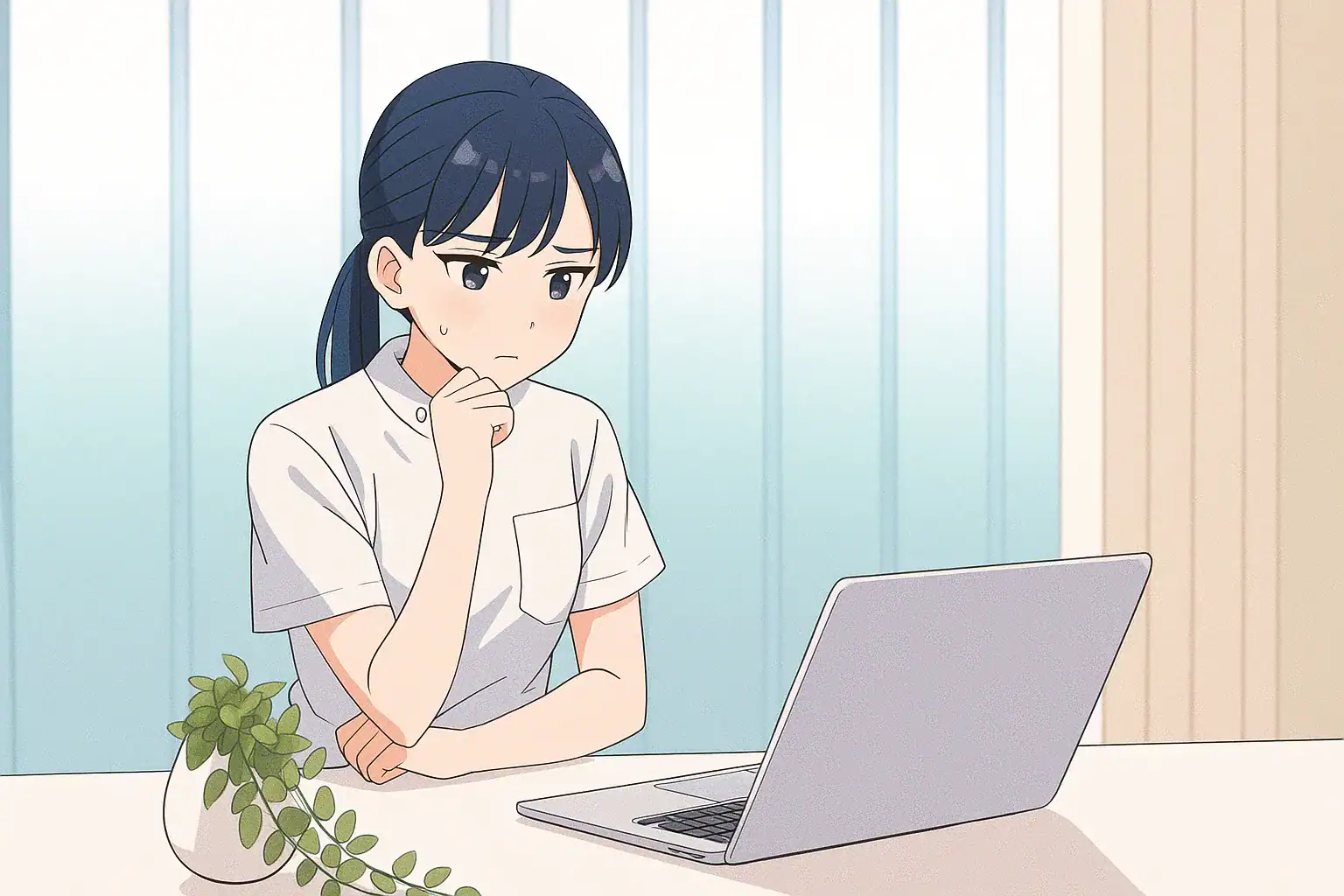 Anime girl sitting at a desk with a laptop.